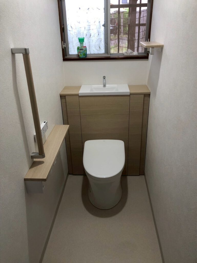 2025.8.5 K.K様邸 毎日使う空間だからこそ、快適さと清潔感にこだわりました。 また、将来を見据えた立ち座りをサポートする手すり、滑りにくい床材を採用し、どなたでも安心して使える空間に。快適さと安全性を両立しました。