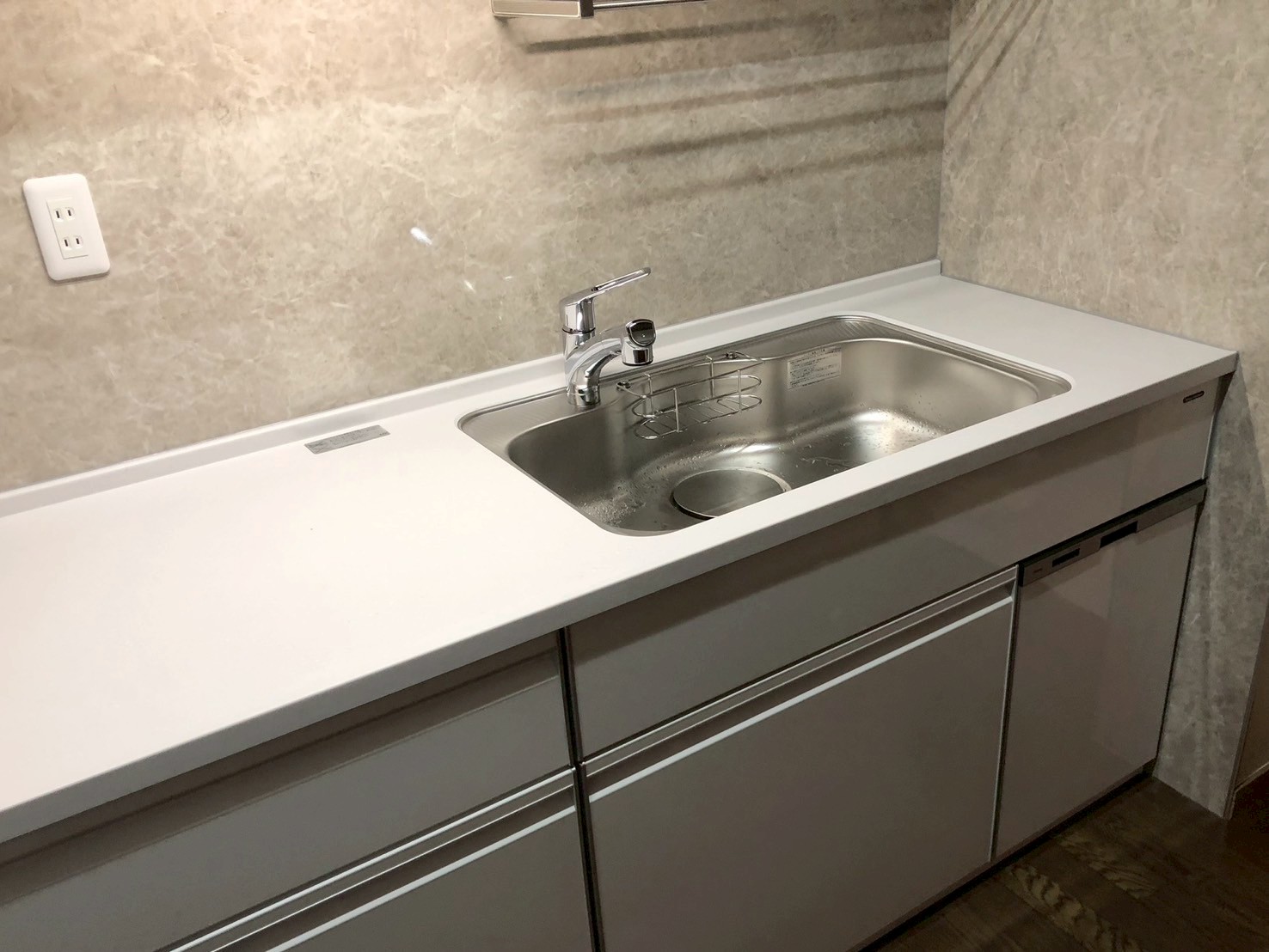 心地よさと機能美を兼ね備えた、上品なキッチン空間へ。薄い水色のキッチンを中心に、グレージュのキッチンパネルと白を基調とした配色で、清潔感あふれるやわらかな印象に仕上げました。